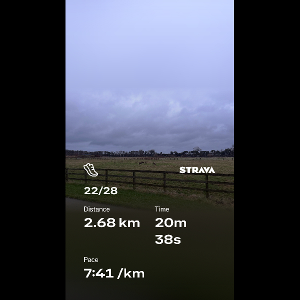 Thursday 26th Feb Just a few runs left to go now! Looking forward to a day off but I’ve enjoyed seeing how much I’ve progressed over the last few weeks. I can run 20mins now without stopping (thanks couch to 5k week 5!) so that’s almost 3km at my pace. Planning to run twice tomorrow as a catch up run for one of the days I missed and hoping to finish on a high with my first 5k on Saturday which I’ll count as another catch up run. Share