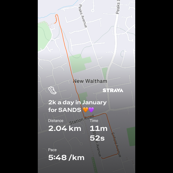 Thursday 1st Jan This January I will be running 2km a day to raise money for SANDS.Sands offers many types of support, including our free, confidential telephone helpline, email support, and online group sessions. We have a UK-wide network of local groups offering peer-support in the community, social media groups helping people connect wherever they are, and free resources for partners, siblings, grandparents, and wider family and friends.